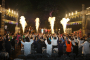 극장 문이 열리자 사람들이 쏟아져나오고 피부에서 붉은빛이 번져
