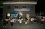 극장 문이 열리자 사람들이 쏟아져나오고 피부에서 붉은빛이 번져