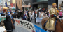 극장 문이 열리자 사람들이 쏟아져나오고 피부에서 붉은빛이 번져
