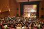 극장 문이 열리자 사람들이 쏟아져나오고 피부에서 붉은빛이 번져