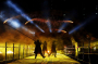 극장 문이 열리자 사람들이 쏟아져나오고 피부에서 붉은빛이 번져