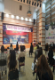 극장 문이 열리자 사람들이 쏟아져나오고 피부에서 붉은빛이 번져