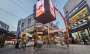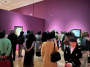 극장 문이 열리자 사람들이 쏟아져나오고 피부에서 붉은빛이 번져