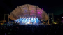 극장 문이 열리자 사람들이 쏟아져나오고 피부에서 붉은빛이 번져