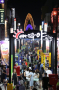 극장 문이 열리자 사람들이 쏟아져나오고 피부에서 붉은빛이 번져