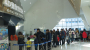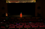 극장 문이 열리자 사람들이 쏟아져나오고 피부에서 붉은빛이 번져