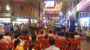 극장 문이 열리자 사람들이 쏟아져나오고 피부에서 붉은빛이 번져