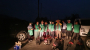 극장 문이 열리자 사람들이 쏟아져나오고 피부에서 붉은빛이 번져