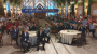 극장 문이 열리자 사람들이 쏟아져나오고 피부에서 붉은빛이 번져