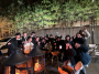 극장 문이 열리자 사람들이 쏟아져나오고 피부에서 붉은빛이 번져