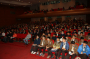 극장 문이 열리자 사람들이 쏟아져나오고 피부에서 붉은빛이 번져