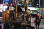 극장 문이 열리자 사람들이 쏟아져나오고 피부에서 붉은빛이 번져