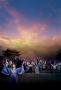 극장 문이 열리자 사람들이 쏟아져나오고 피부에서 붉은빛이 번져