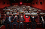 극장 문이 열리자 사람들이 쏟아져나오고 피부에서 붉은빛이 번져