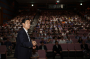 극장 문이 열리자 사람들이 쏟아져나오고 피부에서 붉은빛이 번져