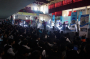 극장 문이 열리자 사람들이 쏟아져나오고 피부에서 붉은빛이 번져
