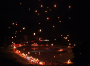 극장 문이 열리자 사람들이 쏟아져나오고 피부에서 붉은빛이 번져