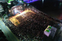 극장 문이 열리자 사람들이 쏟아져나오고 피부에서 붉은빛이 번져