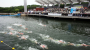 극장 문이 열리자 사람들이 쏟아져나오고 피부에서 붉은빛이 번져