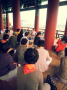 극장 문이 열리자 사람들이 쏟아져나오고 피부에서 붉은빛이 번져