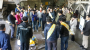 극장 문이 열리자 사람들이 쏟아져나오고 피부에서 붉은빛이 번져