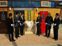 극장 문이 열리자 사람들이 쏟아져나오고 피부에서 붉은빛이 번져