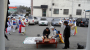 극장 문이 열리자 사람들이 쏟아져나오고 피부에서 붉은빛이 번져