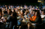극장 문이 열리자 사람들이 쏟아져나오고 피부에서 붉은빛이 번져