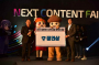 극장 문이 열리자 사람들이 쏟아져나오고 피부에서 붉은빛이 번져
