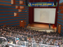 극장 문이 열리자 사람들이 쏟아져나오고 피부에서 붉은빛이 번져