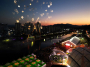 극장 문이 열리자 사람들이 쏟아져나오고 피부에서 붉은빛이 번져