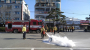 극장 문이 열리자 사람들이 쏟아져나오고 피부에서 붉은빛이 번져