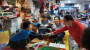 극장 문이 열리자 사람들이 쏟아져나오고 피부에서 붉은빛이 번져