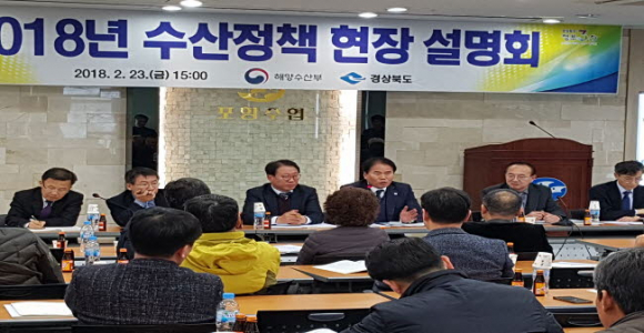 경상북도는 지난 23일(금) 포항 수협에서 해양수산부와 합동으로 어업인, 수협, 지자체 등 관계자 120여 명이 참석한 가운데 「2018년 해양수산 정책설명회」를 개최했다.