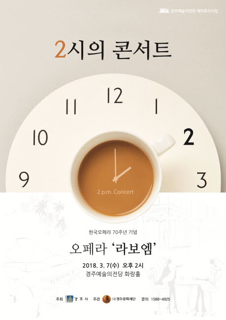 경주문화재단은 오는 3월 7일 경주예술의전당 화랑홀에서 오페라 <라 보엠>을 선보인다. 경주예술의전당의 새로운 레파토리인 ‘2시의 콘서트’의 일환이며 본 사업은 시민들의 문화향유를 높이기 위한 다양한 공연으로 구성되어 있다. 3월에는 대한민국 오페라 70주년이 되는 해인 2018년을 맞아 오케스트라의 생동감 넘치는 연주와 함께 오페라 <라 보엠>을 선보일 예정이다.