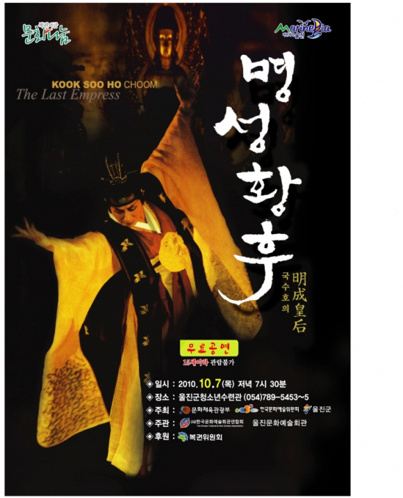 울진군(군수 임광원)은 국수호춤극 ‘명성황후’를 10월 7일 저녁 7시 30분 울진청소년수련관에서 무료 공연한다.