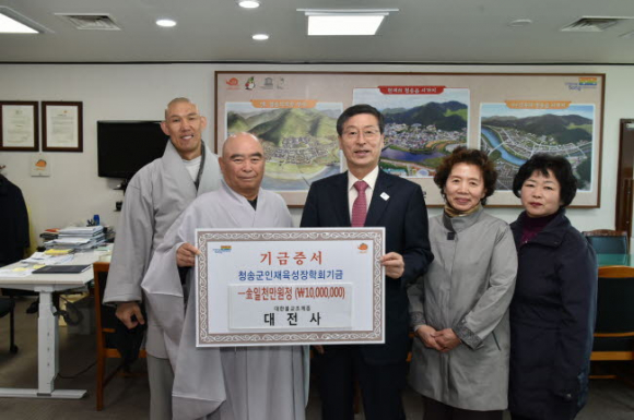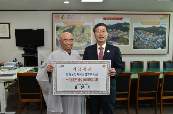 경북 청송군은 주왕산 대한불교조계종 제10교구 대전사(주지 법일 스님)가 14일 (재)청송군인재육성장학회에 장학 성금 1000만 원을 전달했다고 밝혔다.