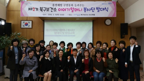 포항시 북구보건소는 유치원, 어린이집 원생들을 대상으로 건강증진과 담배의 해로움에 대한 올바른 인식을 심어주기 위해 제2기 이야기할머니 봉사자를 모집하고 15일 발대식을 가졌다.