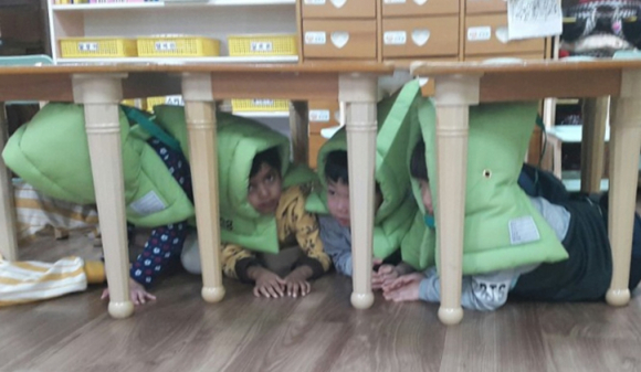 11.15 포항흥해 지진발생 이후 재난안전에 대한 사회적 공감대가 확산되는 가운데 어린이집, 유치원에서도 지진대피훈련이 일상화되고 있다. 지난달 포항시가 지역의 유치원생과 어린이집 원생 2만4천명에게 재난방지모자(방재모자)를 보급하면서부터 유치원과 어린이집 자체적으로 지진대피 훈련을 실시하고 있다. 재난모자는 집안에서 가구나 책 등이 덮칠 경우 머리를 보호할 수 있으며, 평상시에는 방석이나 의자 등받이로도 사용할 수 있다.