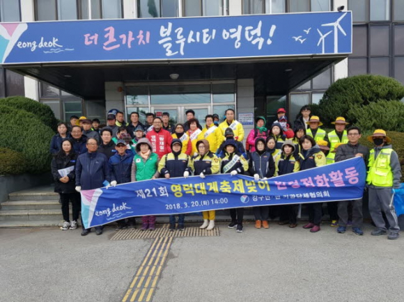 강풍과 꽃샘추위에도 불구하고 강구면새마을협의회․새마을부녀회, 강구여성의용소방대, 강구면적십자여성자원봉사단, 강구면여성자율방범대, 강구면그린어머니회 등 기관단체 회원, 자활 및 노인일자리 참여자, 주민 등이 제21회 영덕대게축제의 성공적 개최를 기원하며 강구 신·구대교에서 해파랑공원, 조종면허시험장 등 총 7개 구간을 깨끗이 정비했다.