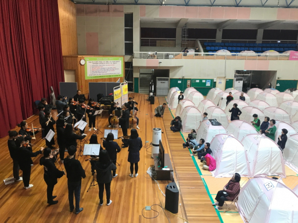 포항시는 지난 21일 저녁 흥해실내체육관 대피소에서 지진피해 지역 주민들을 위로하고 트라우마 치료하기 위한 힐링음악 콘서트를 개최했다.