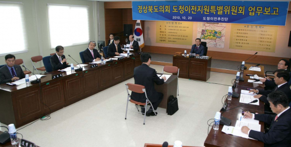 경상북도의회 도청이전지원특별위원회(위원장 박진현)는 10월20일 11시 안동시 풍천면 소재 도청이전신도시건설사업단 회의실에서 제2차 도청이전지원특별위원회 회의를 개최하여 집행부(도청이전추진단장 안종록)로부터 업무보고를 받고 오후에는 도청이전 신도시 예정지 현지 확인 등을 실시했다.