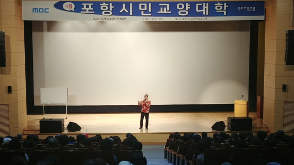 포항시는 25일 뱃머리 평생학습원 덕업관 대강당에서 400여명의 시민들이 참석한 가운데 한의사 김오곤씨를 초청 4월 ‘시민교양대학’을 성황리에 개최했다. 이날 강의에서는 “쉽게 따라하는 한방요법” 이라는 주제로 일반인들도 각 가정에서 쉽게 따라할 수 있는 한방요법을 강의하여 좀 더 건강하고 행복한 삶을 살아가는 데 도움을 주어 400명의 시민들에게 열띤 호응속에서 마무리되었다.