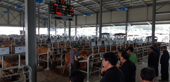 구제역 발생으로 한 달여 간 폐쇄됐던 기계가축시장이 지난 26일 재개장했다. 이날 기계가축시장은 175마리의 한우 암소, 송아지가 출품돼 50여 명의 상인이 입찰하는 경매시장이 열렸다.