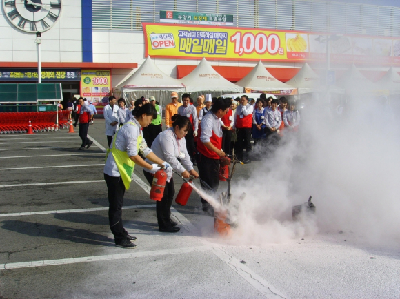 |  | | | ⓒ GBN 경북방송 | | 이날 매장내에서 화재발생을 가상하여 자위소방대에 의한 119신고, 인명대피, 소화기 및 옥내소화전을 이용한 초기 진화에 대해 중점 훈련했다.