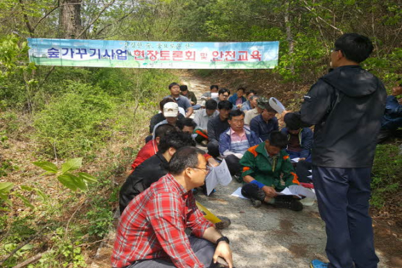 사업 시행에 앞서 지난달 30일 단산면 동원리 산118번지 현장에서 숲가꾸기 설계자, 감리자, 사업시행자, 영림단 40여명이 참석한 가운데 숲가꾸기사업의 품질향상과 산림사업의 효율성을 높이기 위한 숲가꾸기 현장토론회 및 기술 교육을 실시했다.