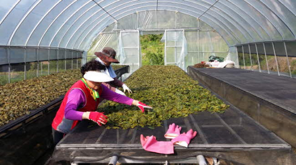 건조뽕잎을 만드는 과정은 새순이 한창 자라는 시기인 오월 상순경 부드러운 뽕잎을 채취해 깨끗하게 잘 다듬고 가마솥에서 뽕잎을 충분히 데친 후 바로 건져 차광막이 씌워진 비닐하우스에서 건조 시키면 된다.