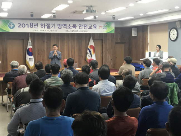 김천시보건소(소장 손태옥)는 지난 5. 10.(목) 보건소3층 회의실에서 감염병 예방을 위해 읍‧면․동 방역담당자 및 방역소독요원 등 70여명이 참석한 가운데 하절기 방역소독 안전교육을 실시했다.