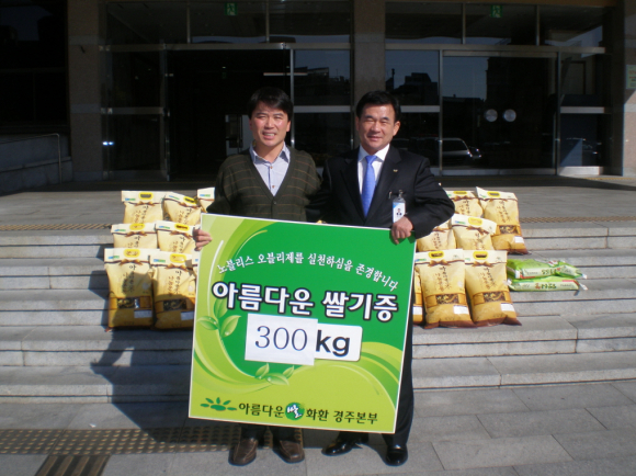 국민생활체육 경주시국학기공연합회(회장 김진식)에서는 제5회 경주국학기공대회를 맞이하여 축하화환으로 받은 쌀 300kg을 2010. 10. 28(목) 지역의 어려운 이웃들을 위해 사용해 달라며 경주시에 전달했다.