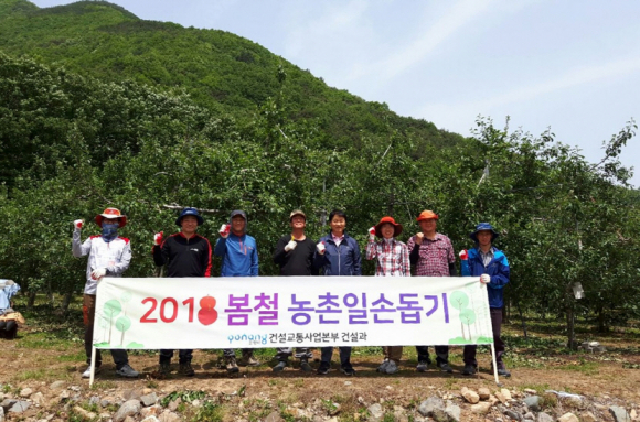 <건설과> 포항시 건설교통사업본부 건설과(과장 황병기) 직원 15명은 15일 고령화와 일손부족으로 어려움을 겪고 있는 기북면 오덕리 과수 농가를 찾아 사과적과 등 봄철 농촌일손돕기 봉사활동을 펼쳤다. |